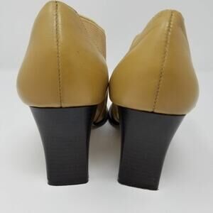 Camel/ Tan Booties by Coup D' Etat Studios. Elasticized sides for ease of foot insert. Brown block heel. Good pre owned condition. heel approx. 3 inches. A great quality shoe. Size 8 M.