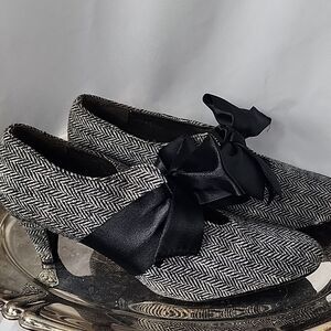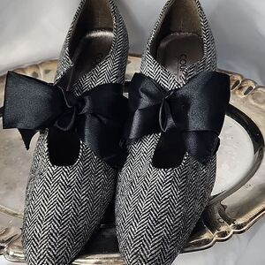Lovely beribboned classic look black satin bow herringbone style 2 1/2" heels size 8.5 M
