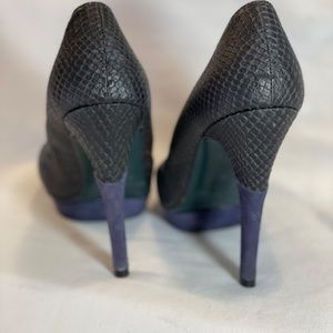 I purchased these beautiful pumps in Spain. They are leather with a grain pattern….. They are definitely a deep deep navy blue. With a different shade of blue suede around the tips of the heels and on the platform of these heels. These gorgeous pumps will not bee seen on anyone else. They have been worn, but are still in great condition. Gorgeous pumps that can be worn with dress, skirt or even blue jeans for a real statement …. Spanish shoes are full leather and well made. Enjoy. Size 38 European…. Which is a 7 1/2