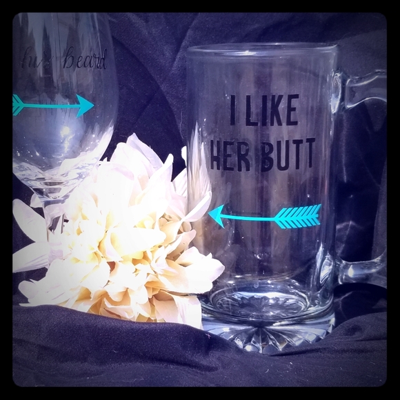 Wine glass and large beer mug. "I like his beard", "I like his butt"