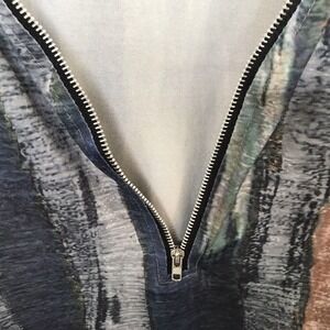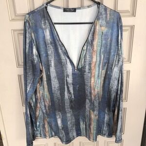 This Cour de Vague top in size L is a stylish piece with a classic theme. The abstract pattern adds an extra touch of uniqueness to this pullover blouse. The V-neckline and long sleeves with classic sleeves type make it suitable for any occasion. The half zip front closure and accents zipper create a trendy twist to a timeless look. Made of lightweight knit material, this pre-owned top is perfect for any season. It comes in blue color and is suitable for both men and women. It is a great addition to any wardrobe and can be dressed up or down.