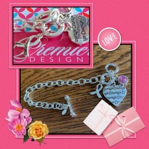 Beautiful breast cancer awareness bracelet by Premier Designs. Silver plate toggle clasp with charms.