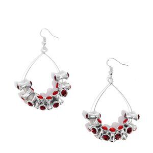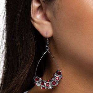 Hourglass-inspired silver fittings, capped on both ends with faceted red and light red rhinestones, are infused and twist along the bottom curve of a silver teardrop wire hoop, resulting in an industrial bold fringe. Earring attaches to a standard fishhook fitting.