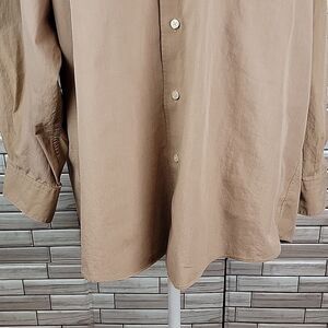 100% Egyptian cotton button-down shirt in a tan color by Damon with a pleated yolk, a scalloped hemline, and a chest pocket. Great pre-owned condition.