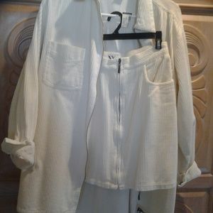 NWT - cute set - cream colored mini skirt matching jacket- skirt 16.5" waist to hem - waist across 13" - jacket under arm across 20" - shoulder to hem 29"