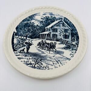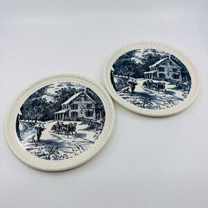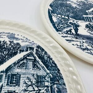 A Currier and Ives, American Winter Homestead, white hostess dessert plates with a blue transfer and a rope edge., Kitchenware, Dining ware, Tableware, Cake Plate, Serveware, Decorative Plates, Collectibles, Home Decor, Wall Decor, Ceramic, Set of 2.