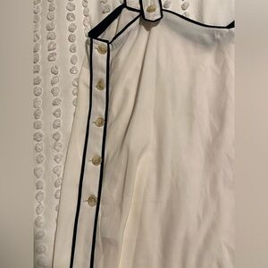 Adorable tank with button sides and adjustable straps with piping on the sides. It fits true to size and has no flaws!