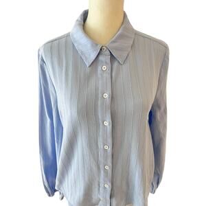 Court & Rowe classic preppy button-down blouse in a soft sky blue hue with subtle textured stripes. Features a collared neckline, full button front, and long sleeves with gathered cuffs. Lightweight and perfect for layering, office wear, or a polished casual look.