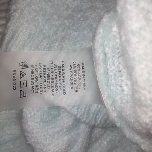 This soft and comfy pullover hoodie is styled with slender neckties and a cozy cable-knit front. Made with 68% Acrylic 28 % Polyester 4 % spandex. This hoodie has only been tried on. The color is actually a cool mint not blue.