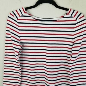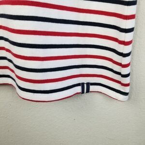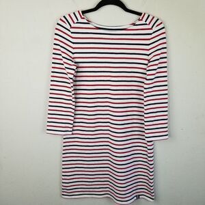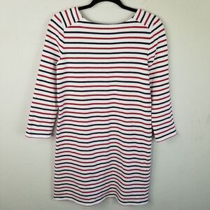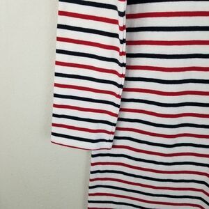 Pretty white knee-length dress with red and blue stripes and 3/4" sleeves! Perfect for a 4th of July party or any any other summer or spring day!