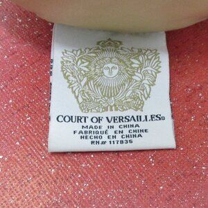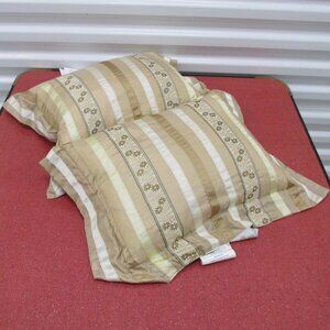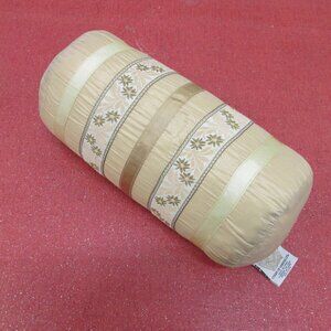 Very lightly used and elegant matched set of four throw pillows from Court of Versailles with stitched on striping bands and embroidered floral patterns. The set consists of: one square pillow, measuring 17 inches x 17 inches and 4 inches thick; one cylindrical pillow, measuring 6 inches round by 14 inches long; and two rectangular pillows measuring approximately 16 inches x 21 inches and 5 inches thick. Material is a durable nylon and polyester blend cover with inner liner stuffed with feather and down.