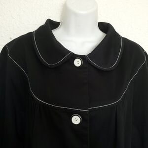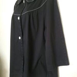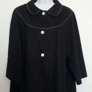 This smock cape jacket is so pretty and looks great on. White stitching detail with large black & white buttons. Fashionable and stylish, pairs well pants, skirts, dresses and even leggings. Perfect for the fall and winter days & evenings. Please see all pics.