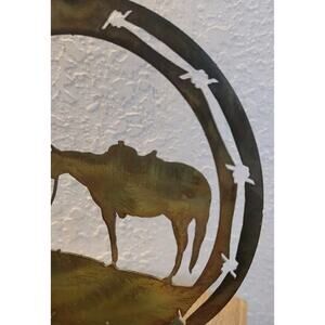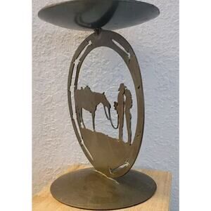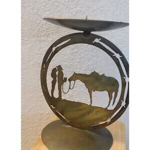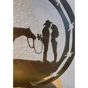 Courting Cowboy w/Horse Medallion Laser Cut Metal Candle Holder Barbed Wire. This is a great gift for any country home. Very nice detail of cowboy hiding flowers behind his back while holding his horse. The scene is surrounded by a ring of barbed wire cut out. Nice condition.