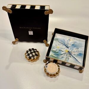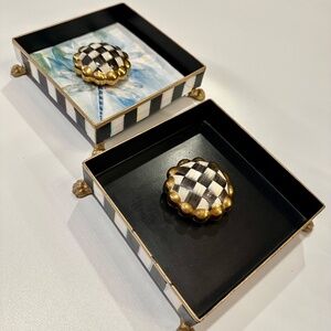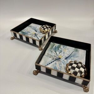 The MacKenzie-Childs Courtly Check Napkin Holder Set (Cocktail) offers an elegant solution for organizing and displaying your napkins. This set includes a metal holder, hand-painted with the signature Courtly Stripe, a set of 20 HolidayCocktail Napkins, and a Courtly Check Ceramic Napkin Weight. Due to the handmade nature of each piece, variations are to be expected. Clean with a damp cloth as needed. Dimensions: 5.5" wide, 5.5" long, 1.5" tall.