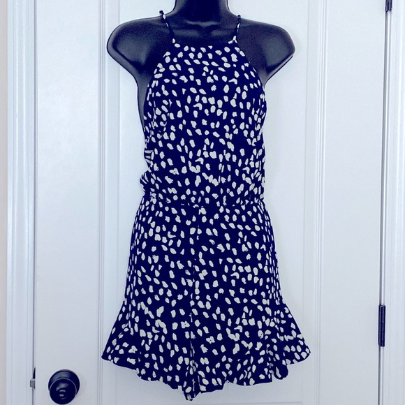 Purchased at local boutique. Adorable navy & white pattern onesie. Back is open with zipper to waist and straps to tie. Elastic stretchy waist, ruffle at bottom. Measures 15” W x 14” Long from waist. Fully lined with shorts underneath.