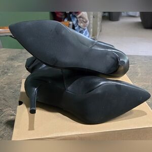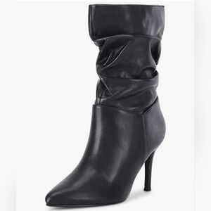These black heeled boots feature a sleek pointed toe and a high stiletto heel, offering a chic and sophisticated look. The slouchy, ruched design along the mid-calf shaft adds a touch of elegance, making them perfect for both formal and casual occasions. Crafted from smooth leather-like material with a slight sheen, these boots are a timeless addition to any wardrobe.