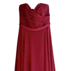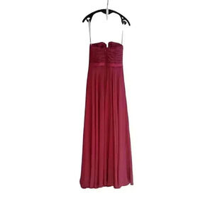 Like new condition. Couture collection size 6. Retail $240. Burgundy lux chiffon fabric. Fully Lined. Ruched bodice. Sweetheart strapless neckline. Bonening for support. Ribbon waistband. On seam back zipper. Fitted bodice. Flared skirt. Chest 34 inches. Waist 28 inches. Underarm to hem 54 inches. Smoke and pet free home.