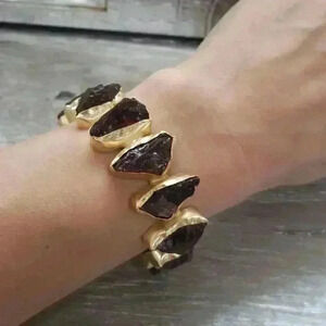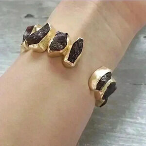 This Handcrafted cuff bracelet features, stunning rough cut semiprecious stones embedded in recycled brass coated to create a stunning natural look! dainty
