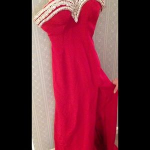 Original-one of a kind custom strapless red gown with rhinestones around top of bust. Front slit to knee. Worn one time. Sewn in breast cups and built in corset can be removed if needed. Hanging straps are also removable. This gown is gorgeous on. Size 8, but can be tailored down and will most likely fit a 10. The designer who did this dress has designed for French Royalty.