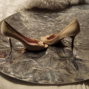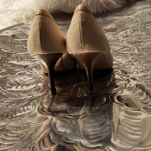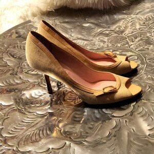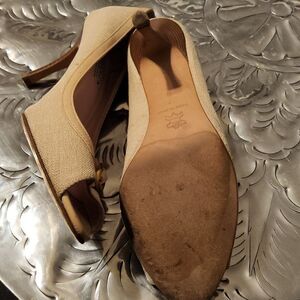 khaki linen, with a gold buckle at the toe, light pink leather insole and leather soles, made initaly size 7, gently preloved