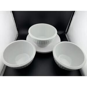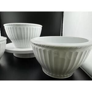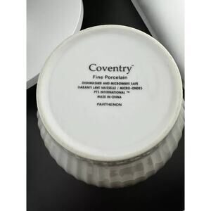 Three virtually pristine bowls available (sold individually). I couldn't find any cracks, chips or blemishes. Coventry's "Parthenon" pattern is a lovely natural white porcelain with a rope pattern along the upper rim, fluted sides (like Greek columns) and a tree pattern along the bottom rim. Elegant, simple and timeless pattern! Dishwasher and microwave safe. 3.25" tall, 5.75" diameter to outer edge and just shy of 5" inner diameter. These are heavy, substantial pieces!