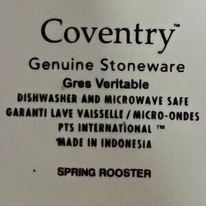 Spring Rooster pattern stoneware mug by Coventry with each side featuring an artful image of a rooster in hues of rusty red, mauve pink and blues. A medley of colorful flowers and leaves wraps around the upper portion of this cream colored mug. White interior and handle. Dishwasher and microwave safe. Measures 4” tall with a 3” diameter; 4.5” across including the handle. Holds 11 fluid oz. Made in Indonesia