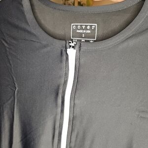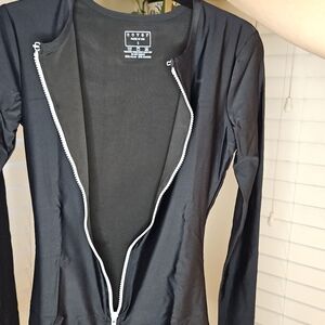 Elegant black one piece with striking white zipper. Ideal for a modern look.