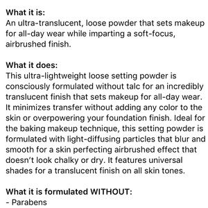 Brand NEW and sealed, travel size (1 g) Cover FX perfect setting powder in Translucent Light.
