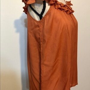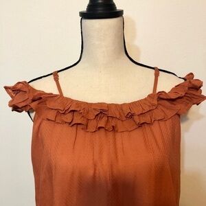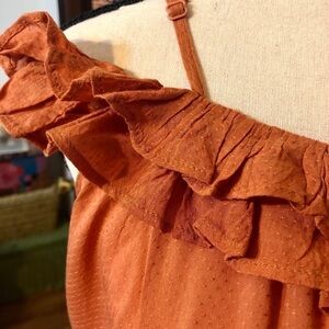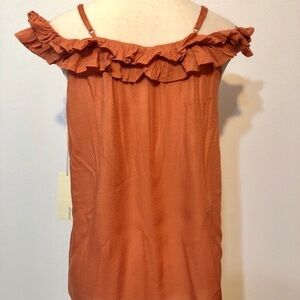 Cover Stitched orange off shoulder top Size M New with tag Adjustable straps Ruffles details Armpit 18” Length 20”