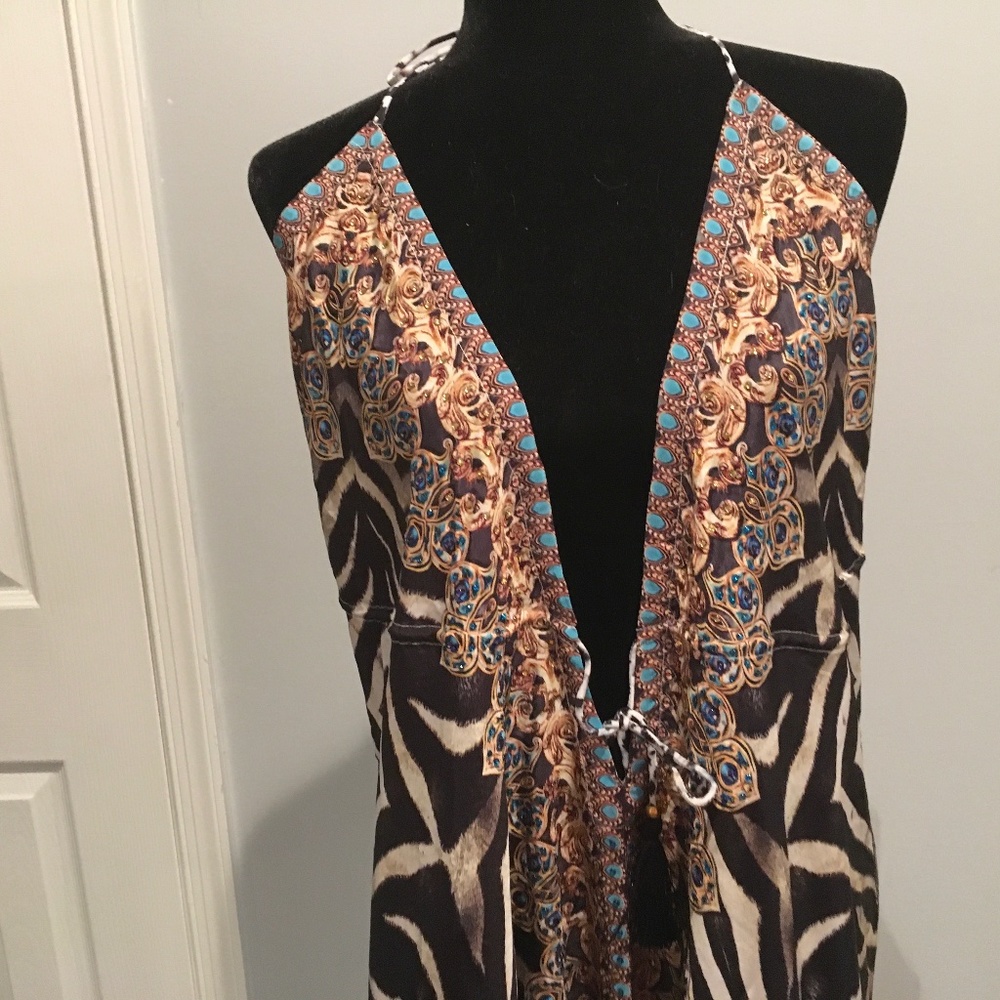 Beautiful floor length high low hem cover up. With jewel appliqué. Crystals and beading.