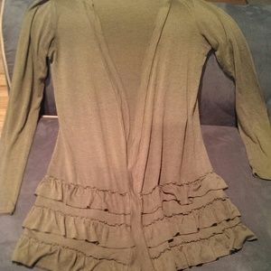 This is an olive colored, light weight cover up. Only worn a couple times and in great condition! Ruffle detailing on the bottom.