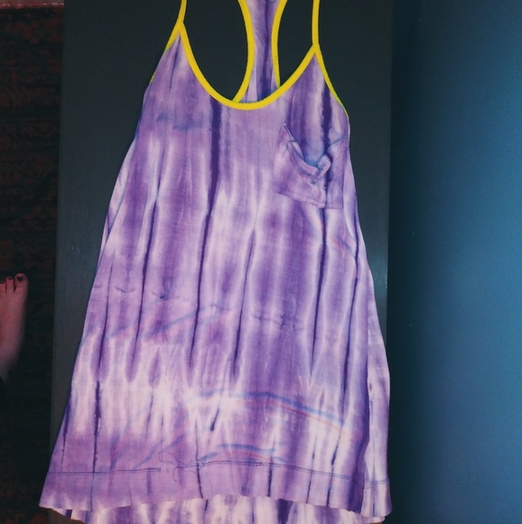 Tie-dye cover up originally bought from Delia's. Size small. Color is purple tie-dye with neon green racerback straps. The the only flaw is the stitching has came out of a tiny section of the bottom of the Cover up. Could easily be fixed if you know how to sew. In fact I will most likely do it myself if I get around to it and have purple string haha