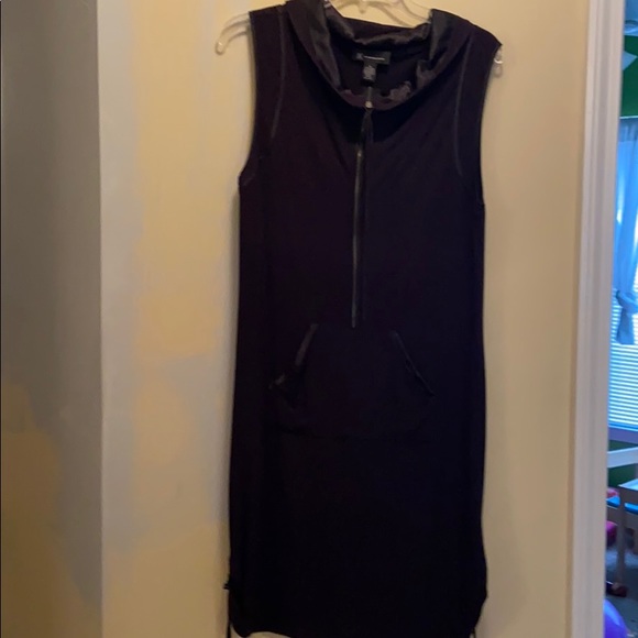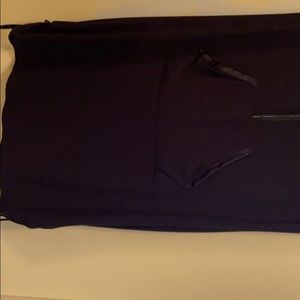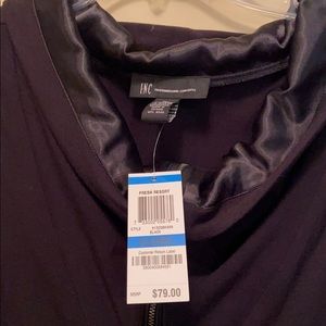 Black with satin trim around neck and arms trim around pocket