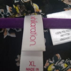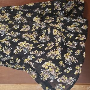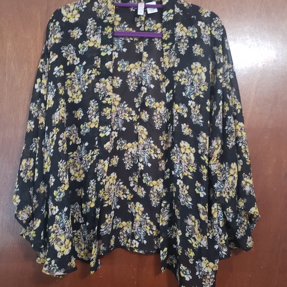 Sheer cover up top with yellow grayish blue and neutral tone floral patten. Wing like sleeves. Good to go over a t stap top.