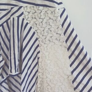 Ric Rac by Anthropologie size M cover up. Classic navy and white stripes with lace inlays. Super soft cotton, machine wash. Front from neck to shortest point measures 18" and has handkerchief hem so it measures longer in some places. Sheer but not see through. Can be worn as a top