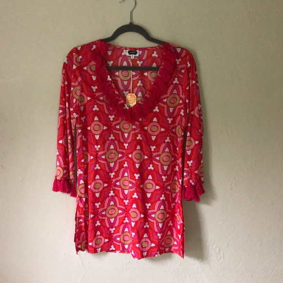 Beautiful bright cover-up with tassels at neckline & 3/4 length sleeve. Lightweight 100% cotton.