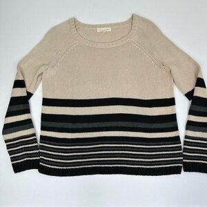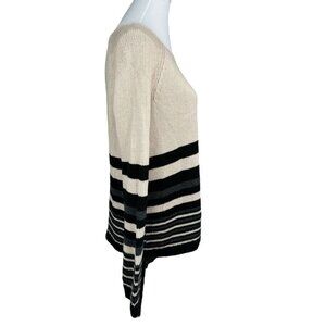Covered by Suss women's size small knit sweater. it has long sleeves, scoop neck, tight-knit, cream, gray and black stripes, soft flowy and stretchy fabric. Materials 60% cotton, 40% rayon. Care machine wash cold lay flat to dry. MFSR:$130.00 Condition is preloved very good as shown in pictures. Please preview the measurements to ensure fit.