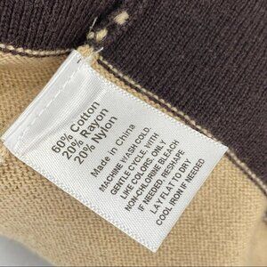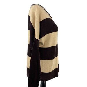 Covered by Suss women's size small sweater, it is brown and tan striped, pull over, scoop neck, long sleeves, stretchy, oversized, soft tight-knit, comfortable medium weight fabric. Materials 60% cotton, 20% rayon, 20% nylon. Care machine wash cold lay flat to dry. Condition is preloved very good as shown in pictures. Please preview the measurements to ensure fit.