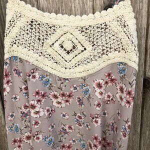 festival, softgirl, cottagecore, farmhouse, liberty floral, lace, crochet, spaghetti strap, vanilla girl, boho, bohemian