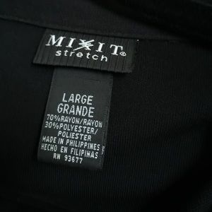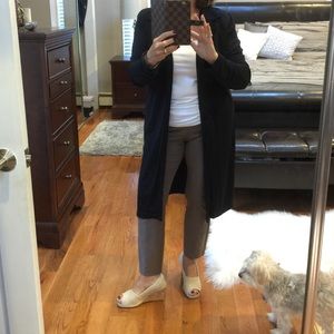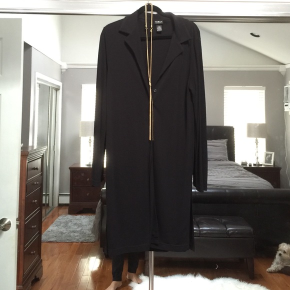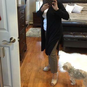 Pretty stretch jacket , I used once . Wore to a party wanted to cover my arms .. So many ways to use this coverup . Has slits on both sides .. I'm 5 2 inches tall . Thought I'd show you how long it is in picture ..my puppy wanted to be in the picture :)