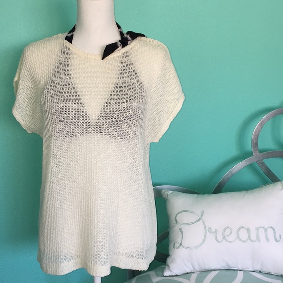 A very neutral cover-up for your most colorful swimsuits. Crochet-like in material, looks fine and delicate but strong material. Will fit from small to medium. EUC