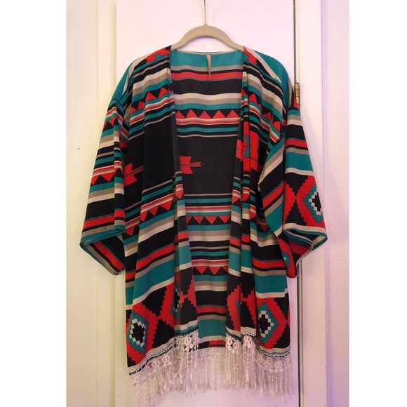 Perfect for the pool or adding to any outfit! I wore with leggings and a flowy white tank- I just don’t love the piece anymore. White tassels hit right above the butt- sleeves below the elbow. Very cute I just don’t like so much color!
