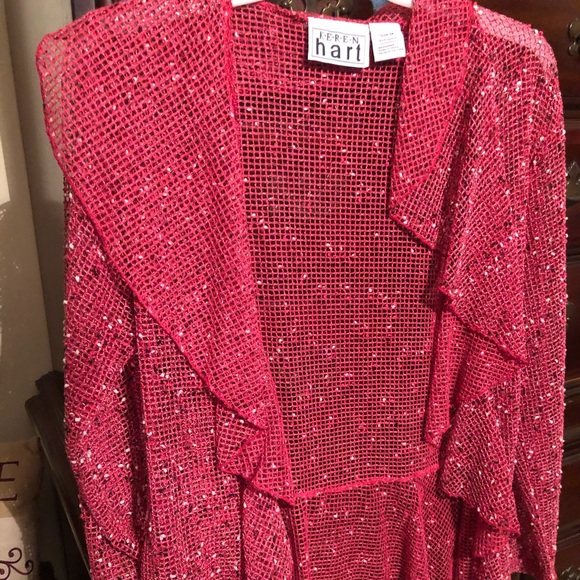Burgundy, reddish,pinkish with specs of black and white, long sleeve, ruffle down the front and around bottom
