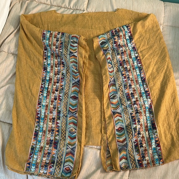 No brand name available. One size, mustard top could be used as a lightweight poncho or coverup. Embroidered detailing.