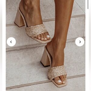 Our CRETE heels feature a woven raffia strap, a slightly flared wooden block heel and tapered square toe.