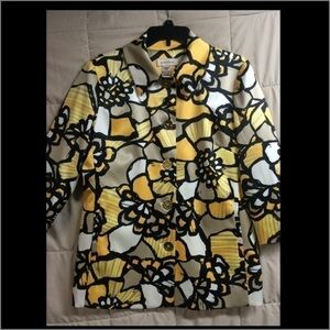 Covington 3/4 Sleeve Button Up Coat. Gold buttons(5 total) they appear to have scratches in the metal but it still shows all gold. 2 front pockets that are still stitched shut. Tan, yellow, cream, and black floral abstract print. Collared. Shell: 97% Polyester 3% Spandex. Lining: 100% Polyester. Machine was cold separately. Tumble dry low. Cool iron if needed. Only worn once. Pls note cover photo has a filter on, refer to the other pics for correct color tone. 18'' from armpit to bottom.