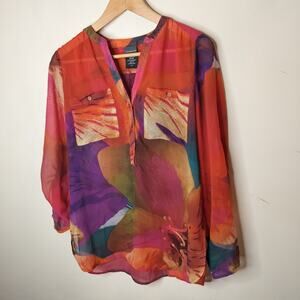 Covington Floral Blouse Tab Sleeve Sheer Watercolor Art to Wear