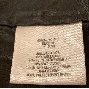 Shell 62% wool 31% polyester 6% rayon 1% other Lining 100% polyester