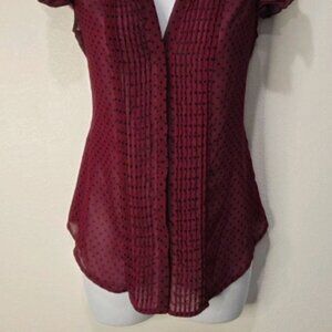This Short Sleeve Button Up is a stylish and feminine top perfect for women looking for a chic piece to add to their wardrobe. This sheer polka dot blouse features ruffled cap sleeves, and a flattering burgundy and black color combination.