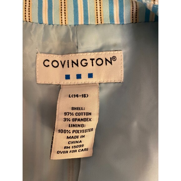 This is a Covington Jacket Summer Colors L (14-16). It is lined. 1 Button closure. 2 Pockets with flaps. It is in very good condition.